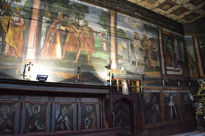 Wnętrze kościoła zachwyca wyjątkowymi malowidłami pokrywającymi niemal całe ściany. Na suficie i górnych częściach ścian namalowanych jest 14 wielkich obrazów, przedstawiających sceny z życia św. Jana Chrzciciela. W dolnych częściach ścian i przy obwodzie pułapu są wizerunki świętych. W sumie są tam 53 obrazy postaci świętych i królów.