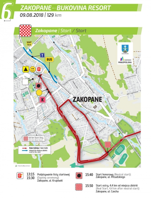 Start VI etapu nastąpi w czwartek 9 sierpnia o godz.15.40 przy Oczku Wodnym na ul. Krupówki, runda honorowa przebiegać będzie ulicami: J. Piłsudskiego, Br. Czecha, S. Żeromskiego, K. Makuszyńskiego, J. Piłsudskiego, Br. Czecha, Rondo Jana Pawła, Dr. na Bystre wyjazd w stronę Cyrhli