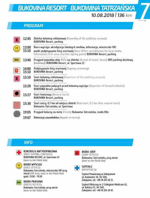 Oba ostatnie etapy, 6 i 7, zaplanowane na czwartek i piątek, rozegrane zostaną na drogach Podhala. 9 sierpnia kolarze pojadą trasą ze startem w Zakopanem, a metą w Bukowinie Tatrzańskiej, a 10 sierpnia początkiem i końcem wyścigu będzie Bukowina Tatrzańska. Kierowcy muszą liczyć się z tym, że w dniu wyścigu będą występować w utrudnienia w miejscowościach, przez które poprowadzi trasa wyścigu. Na czas przejazdu zawodników drogi będą zamykane. W Zakopanem kolarze będą gościć w czwartek 9 sierpnia: