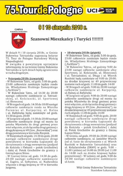 Największe utrudnienia, jak co roku, będą w Bukowinie Tatrzańskiej. Przez dwa dni wyścigu przejazd główną drogę przez miejscowość będzie całkowicie lub częściowo niemożliwy.