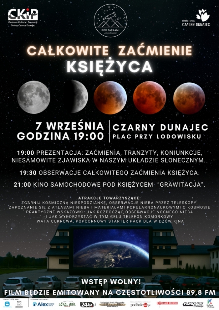 Już 7 września od godz. 19. rozpocznie się oryginalna impreza. Na placu przy lodowisku w Czarnym Dunajcu na miłośników astronomii i nie tylko czeka wiele atrakcji. Będzie astronomiczna prelekcja, wspólne obserwacje zaćmienia i gwiazd przez teleskopy. Zobaczymy atlas nieba, będą też materiały popularnonaukowe.Organizatorzy przygotowali też w ramach samochodowego Kina pod Księżycem - pokaz filmu "Grawitacja".