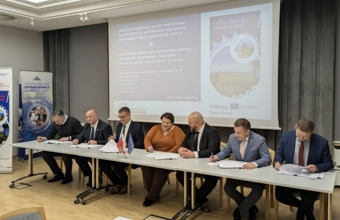 NOWY TARG. Polscy i słowaccy partnerzy podpisali wczoraj umowę partnerską na realizację projektu pt. Historyczno-kulturowo-przyrodniczy szlak wokół Tatr - etap 5 w ramach Programu Interreg Polska - Słowacja 2021-2027. Podczas spotkania przedstawiono również zakres inwestycji zaplanowanych na lata 2026-2027.