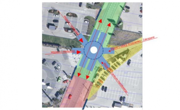 - Wysoce pożądanym jest wykonanie ronda na skrzyżowaniu ul. Szaflarskiej i drogi nr 362763K, które zapewniłoby wyższy poziom bezpieczeństwa ruchu drogowego. Zgodnie z proponowaną ideą istniejące zjazdy bezpośrednie z dwóch restauracji: McDonald?s i KFC, a także zjazd z centrum handlowego na ul. Szaflarską zostałyby przeznaczone do likwidacji, zaś w to miejsce wykonane byłby zjazdy na rondo. Schemat ronda poniżej: