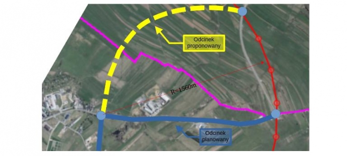 Długość projektowanego odcinka przebudowy DK49 wynosi około 1560m (w linii prostej). Przyjmując jako wiodącą długość przebudowy wyrażoną promieniem, to warto jest rozważyć budowę odcinka schematycznie oznaczonego poniżej kolorem żółtym, który będzie stanowił przedłużenie projektowanego odcinka