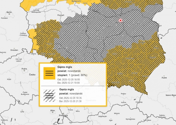 Ostrzeżenie o gęstych mgłach w powiatach nowotarskim i tatrzańskim wydał dziś Instytut Meteorologii i Gospodarki Wodnej.