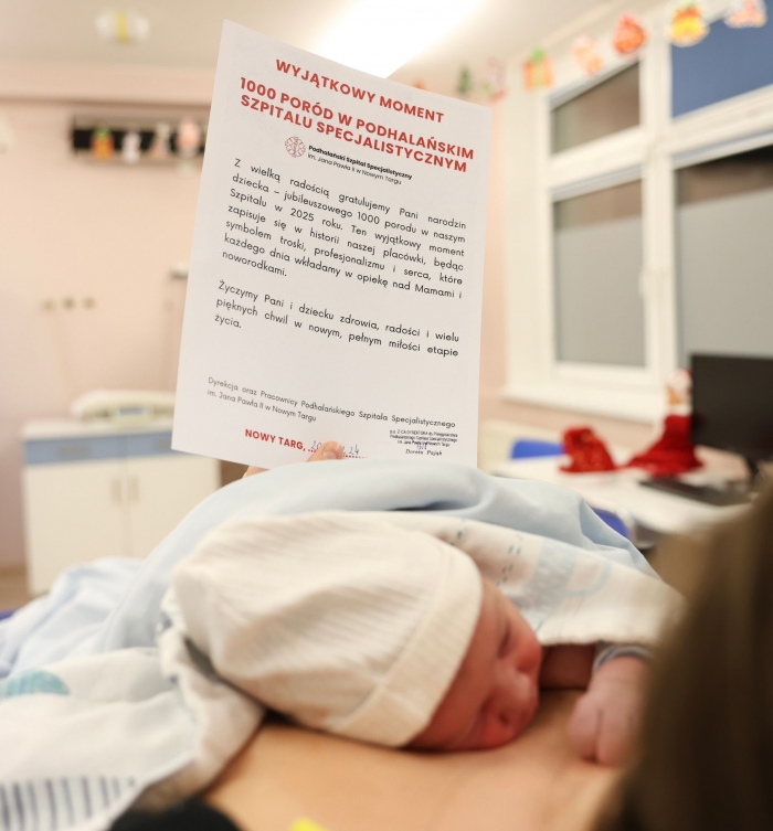 Tysięczny noworodek urodzony w Podhalański Szpital Specjalistyczny im. Jana Pawła II w Nowym Targu to dziewczynka. Zosia przyszła na świat 22 grudnia 2025 r. o godzinie 19:32.
