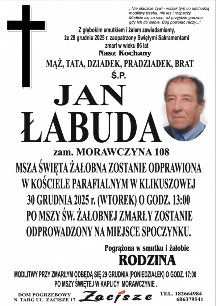W wieku 86 lat zmarł Jan Łabuda z Morawczyny - długoletni sołtys Morawczyny, reaktywował działalność OSP, brał czynny udział w budowie remizy i kościoła, wielki społecznik.