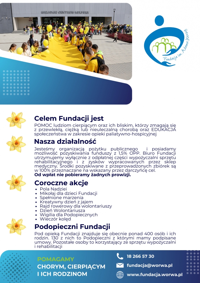 "Nawet najmniejszy gest dobroci może zmienić czyjeś życie" - to zdanie najlepiej oddaje misję i codzienną działalność Fundacji im. Adama Worwy. Od lat organizacja niesie realną pomoc osobom chorym, cierpiącym oraz ich rodzinom, a także prowadzi działania edukacyjne związane z opieką paliatywno-hospicyjną.