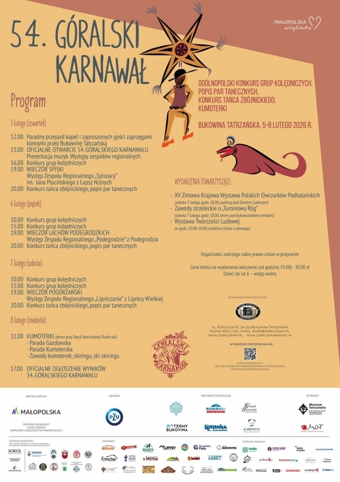 Na program 54. Góralskiego Karnawału składa się Ogólnopolski Konkurs Grup Kolędniczych, Konkurs Tańca Zbójnickiego, Popisy Par Tanecznych oraz finałowe Kumoterki.