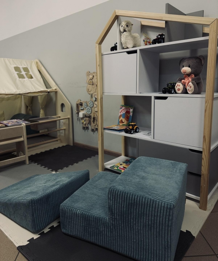 Strefa zabaw, choć niewielka, została zaprojektowana tak, aby zająć uwagę dzieci w czasie, gdy ich opiekunowie załatwiają urzędowe formalności. To prosty sposób na rozładowanie napięcia, które często towarzyszy maluchom w oficjalnych budynkach.