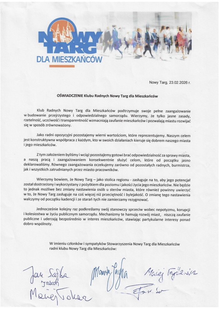 NOWY TARG. "Jako radni opozycyjni pozostajemy wierni wartościom, które reprezentujemy. Naszym celem jest konstruktywna współpraca z każdym, kto w swoich działaniach kieruje się dobrem naszego miasta i jego mieszkańców" - czytamy w przesłanym nam "oświadczeniu klubu radnych Nowy Targ dla Mieszkańców po zmianach w prezydium nowotarskiej Rady Miasta".