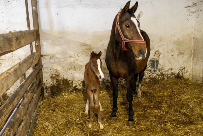 Przechodzimy do budynku, gdzie są konie sportowe. Tu już sufity zostały zdjęte, a szmaty wyrzucone. Spoglądam na dorodną kobyłę z źrebięciem - jakby niepasującą do obskurnych warunków starego kurnika. Kolejne dziesięć klaczy właśnie przebywa na wybiegu.