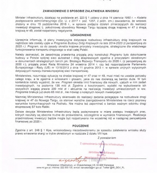 Dyrektor Departamentu Dróg Publicznych dodaje, iż "ministerstwo skierowało do realizacji zadania polegające na rozbudowie drogi krajowej nr 47 do Nowego Targu, co stanowi wyraźne zaangażowanie Ministerstwa na rzecz poprawy warunków komunikacyjnych na Podhalu. Nie można też zapomnieć o bardzo ważnym odcinku drogi ekspresowej S7 koło Rabki-Zdroju".