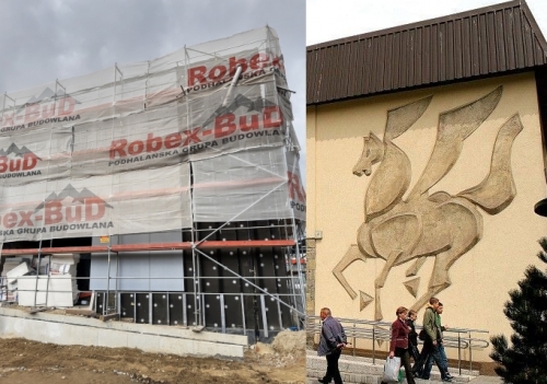- Pegaza, ze względów technicznych, nie dało się ściągnąć. To był tynk - mówił podczas konferencji prasowej szef firmy budowlanej Stanisław Potoczak, zapewniając, że nowy Pegaz będzie się podobał. - Wszyscy traktują to, jakby to była płaskorzeźba, lecz wizerunek ten był wykonany na zaprawie zarzuconej na ścianę. Nie dało się go zdjąć - podkreślił burmistrz. - Pegaz wróci jednak na ścianę, nowy, w nowej odsłonie, odświeżony, dynamiczny. Liczący sobie kilka dekad wizerunek przedstawiający skrzydlatego konia został wykonany przez Wacława Czubernata i Marka Medweckiego. Podczas prac remontowych został usunięty. Nowy ma nawiązywać do pierwowzoru.