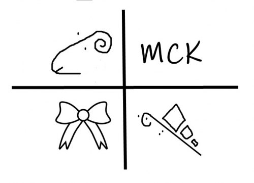 Rysunek 2: Koncepcja czteropaku zwędzona pewnemu winiarzowi z Kachetii co jest jednocześnie profesorem plastyki. Narysowałem mu jedną plakietkę na wino, to się nie obrazi. Góra po lewej owca. Na dole wstążka. Wszystko jasne. Prawy dół – stary pegaz zmiksowany z nagą panną, której z tyłka zdarto to co teraz wisi na froncie bunkra chałtury. Wyszedł niewinny motylek. No i skrót MCK. Ale jak komisja zmieni na MCCh daję zgodę.