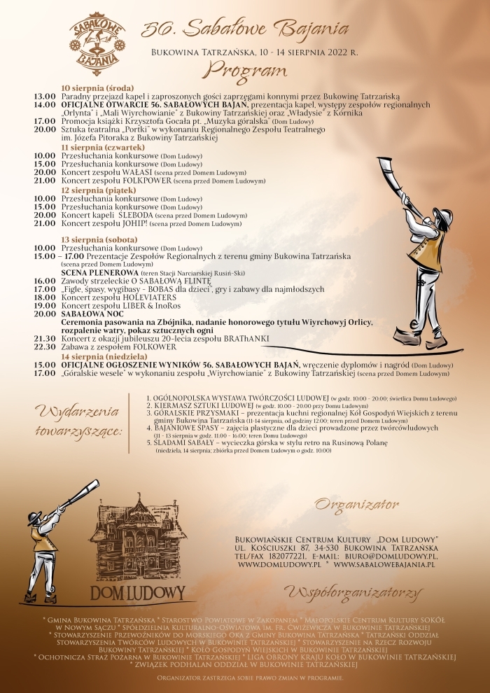 56. Sabałowe Bajania rozpoczną się tradycyjnym paradnym przejazdem kapel i zaproszonych gości przez Bukowinę Tatrzańską. O 17.00 organizatorzy zapraszają na promocję książki Krzysztofa Gocała „Muzyka Góralska”, zaś wieczorem – tak jak przystało na wakacyjną środę, na deskach Domu Ludowego wystąpi Regionalny Zespół Teatralny im. Józefa Pitoraka z Bukowiny Tatrzańskiej. „Portki” pióra Józefa Pitoraka to sztuka ciesząca się wśród publiczności chyba największą popularnością.W sobotę przy Domu Ludowym, po części konkursowej, zaprezentują się zespoły regionalne z terenu gminy Bukowina Tatrzańska.