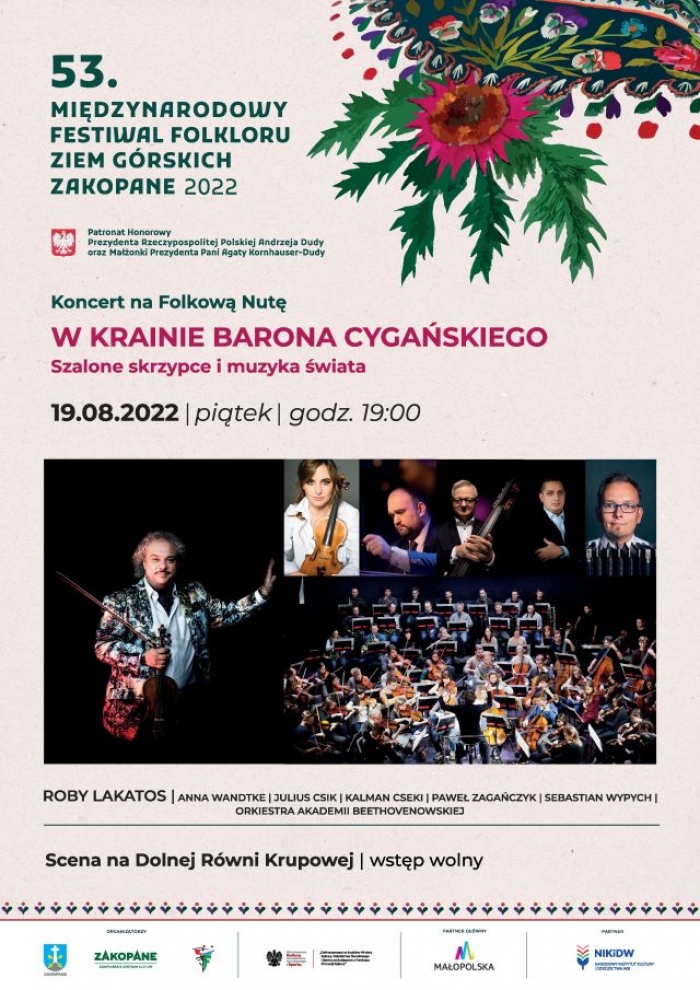 Artyści zapraszają w magiczną podróż do nostalgicznego świata węgierskiej puszty, poprzecinanej gorącą i namiętną wirtuozerią skrzypiec oraz w świat orientu, muzyki filmowej, muzyki świata i otwartej improwizacji.Znają go wszystkie najbardziej prestiżowe sale koncertowe na trzech kontynentach. Koncertowi blasku doda bardzo ceniona przez Robiego Lakatosa wybitna polska skrzypaczka, solistka i kameralista - Anna Wandtke. Tytułowa „Skrzypcowa Dusza - Violin Soul”, to w głównej mierze repertuar debiutanckiej i solowej płyty artystki, wydanej oficyną DUX, do której zaprosiła Robiego Lakatosa i innych znakomitych artystów. Wspomnianej dwójce wybitnych wirtuozów skrzypiec towarzyszą wybitni soliści. Na koncertowych cymbałach zagra wybitny wirtuoz, jeden z czołowych węgierskich cymbalistów młodego pokolenia - Julius Csik. Obok niego przy fortepianie zasiądzie wirtuoz, improwizator - Kalman Cseki. Na akordeonie zagra wszechstronny gdański akordeonista, solista - Paweł Zagańczyk. Na kontrabasie zagra oraz znakomitą Orkiestrę Akademii Beethovenowskiej i koncert poprowadzi znany polskiej publiczności wybitny artysta/wirtuoz - solista, kameralista, eksperymentator, założyciel wielu zespołów - Sebastian Wypych.
