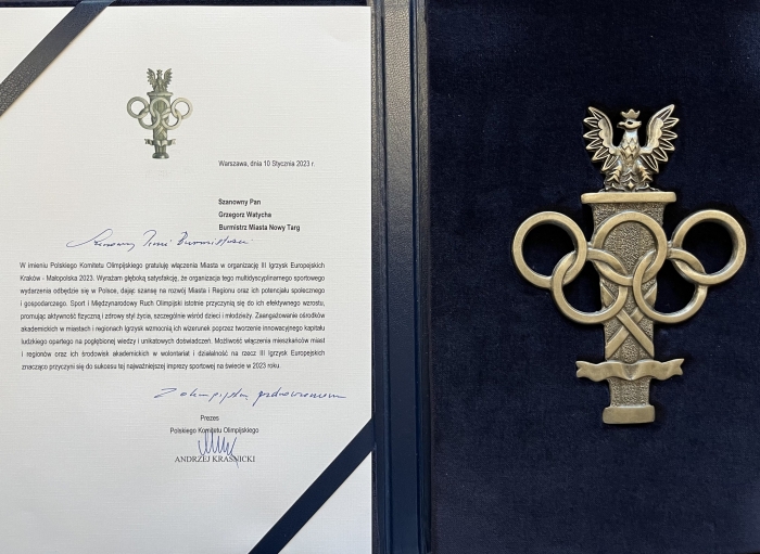 Grzegorz Watycha odebrał list gratulacyjny dotyczący "włączenia miasta w organizację Igrzysk". Przypomnijmy, że w Nowym Targu rozegrany zostanie turniej bokserski. Pod koniec ub. roku radni wojewódzcy zdecydowali o udzieleniu pomocy finansowej na rzecz Miasta Nowy Targ oraz Gminy Krynica-Zdrój w związku z III Igrzyskami Europejskimi. Przekazane środki - 980 tysięcy zostaną wykorzystane na budowę toru MTB XCO na Górze Parkowej oraz 2,8 mln złotych na roboty remontowe w Miejskiej Hali Lodowej w Nowym Targu.