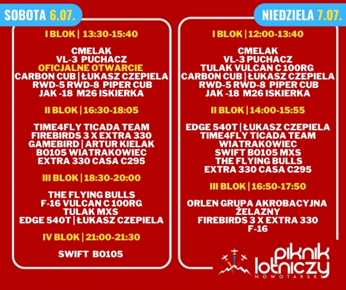 W tym roku, w dniach 6-7 lipca br. na terenie lotniska Aeroklubu Nowy Targ, odbędzie się już XIII edycja tego wydarzenia. Dzięki partnerowi strategicznemu – Marszałkowi Województwa Małopolskiego oraz przy wsparciu sponsorów głównych takich jak Miastio Nowy Targ, Grupa Autoremo, Termy Bukovina i PCD Salami na podhalańskim niebie będziemy podziwiać grupy akrobacyjne i formacje, wśród których znajdą się Orlen Grupa Akrobacyjna Żelazny, The Flying Bulls, FireBirds czy piloci Piper Cub. Niebywałą atrakcją będzie także przelot myśliwca F-16.Gwiazdą pokazów będzie Łukasz Czepiela, który zaprezentuje się w samolocie Edge 540 i Carbon Cub oraz Artur Kielak w swoim GameBird GB1. Przy tej wspaniałej dwójce nie mogło zabraknąć także Mariusza Szarawary za sterami Extra 330.Oprócz nich zobaczymy podczas pokazów w locie: Bolkow Bo-105, Vulcan C100RG, VL-3, PZL M26, RWD 5R, Robinson R-44, Casa C295, RWD 5R, RWD-8, TIME4FLY TICADA TEAM, Wiatrakowiec Magni Gyro M-16, Cmelak, MX2, Jak-18, Swift, Bushcat, Tulak, SZD Puchacz – akrobacja.