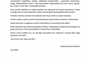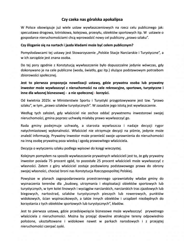 Jako organizacja społeczna Federacja Obrony Podhala prosimy o umieszczenie w całości informacji w sprawie przyszłych wywłaszczeń. Prywatny inwestor będzie mógł wywłaszczyć z prywatnych nieruchomości pod różnego rodzaju prywatny biznes. Nie zły geszeft. Ewenement w skali UE. Zagrożenie jest bardzo duże dla wszystkich właścicieli nieruchomości. Nikt nie będzie miał spokojnego posiadania.Nawet za komuny nie odważono się tak robić. Prace nad ustawą trwają cicho od 2025roku. Bardzo ważne jest, aby Polacy obudzili się z letargu. W art. 6 ustawy o zagospodarowaniu przestrzennym zapisane jest wiele możliwości do wywłaszczeń. Wniosek jest aby dopisać kolejny pod "prawa szlaku, w tym prawa szlaku turystycznego" (patrz i przeczytaj; https://www.sejm.gov.pl/Sejm10.nsf/transmisja.xsp?documentId=0A9D7CEF4966E26DC1258D3B0054C6CD&symbol=TRANSMISJA_ARCH&info=T z dnia 20.11.2025r.)