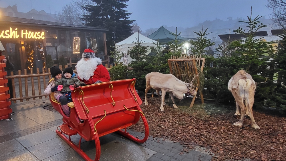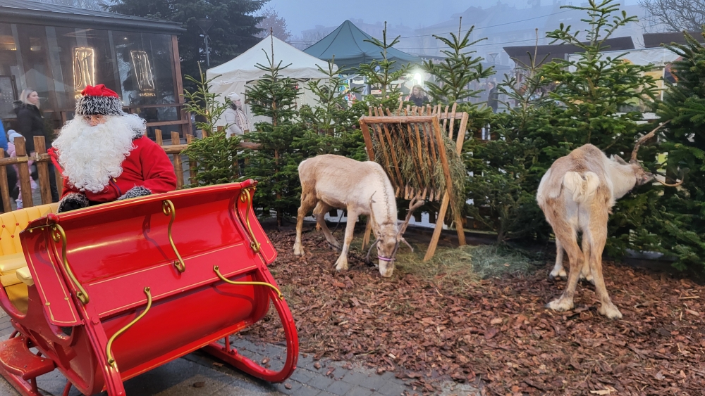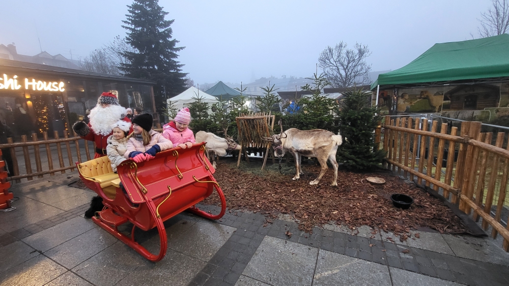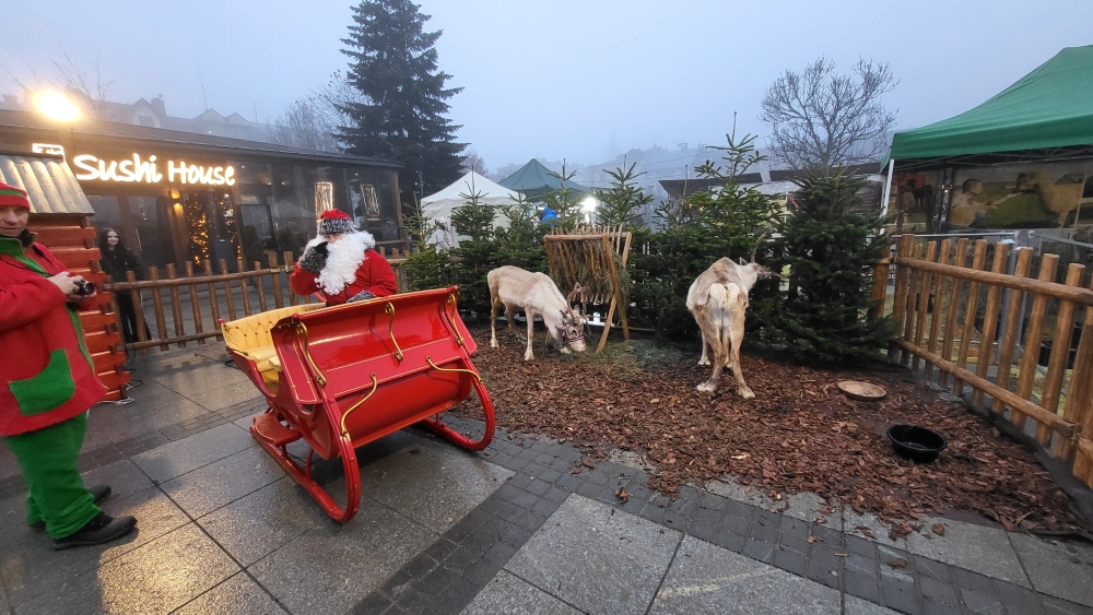 Zagroda św Mikołaja z Reniferami na Rynku w Nowym Targu na Jarmarku Bożonarodzeniowym