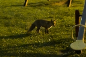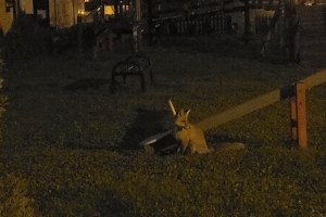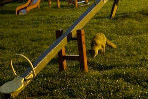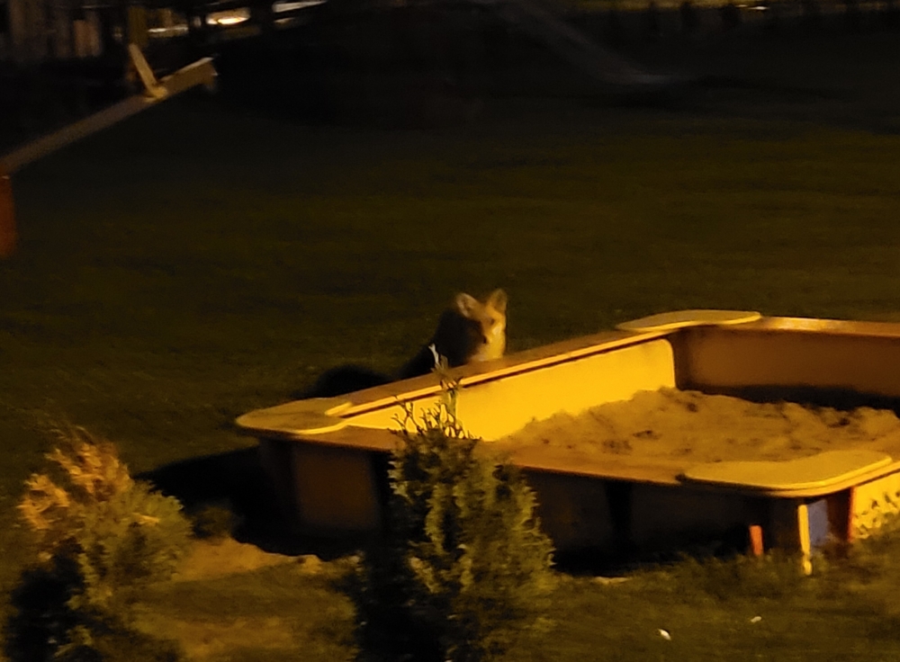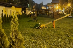 Lisek na placu zabaw obok wieżowców na Szaflarskiej