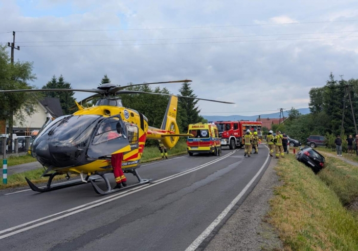 Auto, w którym jak ustaliliśmy jechała młoda kobieta, na zakręcie wypadło z jezdni i uderzyło w fosę. Samochód ma mocno rozbity przód. Stan poszkodowanej jest poważny. Na miejsce wezwano śmigłowiec Lotniczego Pogotowia Ratunkowego, który zabrał ją do szpitala. r/