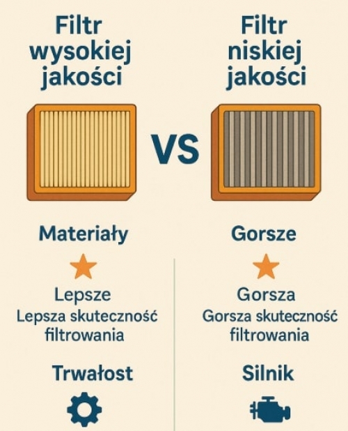 Na infografice przedstawiono kluczowe różnice między filtrami wysokiej i niskiej jakości, które mają szczególne znaczenie podczas wyboru części samochodowych w sezonie letnim.