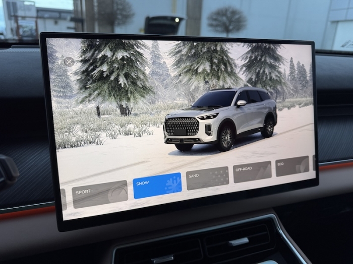Inteligentny napęd na cztery koła reaguje w czasie około 100 milisekund, dynamicznie rozdzielając moment obrotowy w zależności od warunków. Kierowca ma do dyspozycji sześć trybów jazdy, w tym Snow, Mud i Off-Road, co dobrze wpisuje się w charakter samochodu testowanego w zimowych, górskich realiach.