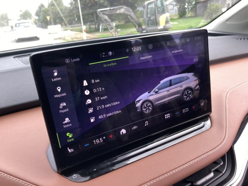 Po pierwsze Enyaq to pierwszy samochód spod szyldu czeskiego producenta od podstaw stworzony jako pojazd elektryczny i tylko w takiej wersji występuje. O ile inne modele, jak choćby testowany przez nas kiedyś CityGo, to tylko elektryczne odmiany aut o tradycyjnej wersji napędu, o tyle Enyaq to rasowy elektryk od samego początku do samego końca. Widać to zwłaszcza we wnętrzu samochodu, które mimo że nawiązuje naturalnie do innych modeli marki, robi zrażanie skromnością i nowoczesnością zarazem. Centralnym punktem jest spory ekran dotykowy, odpowiedzialny za większość ustawień samochodu od radia, nawigacji czy nadmuchu poczynając a na parametrach ładowania kończąc. Spory to może jednak nie najlepsze określenie - ekran jest ogromny i góruje nad deską rozdzielcza. Faktem jest jednak, że zgromadzone w jednym miejscu centrum dowodzenia sprawdza się, informacje są czytelne, a wprowadzanie ustawień łatwe. Konstruktorzy zadbali nawet o półkę pod samym ekranem, na której możemy oprzeć nadgarstek by łatwiej operować na dotykowym ekranie.
