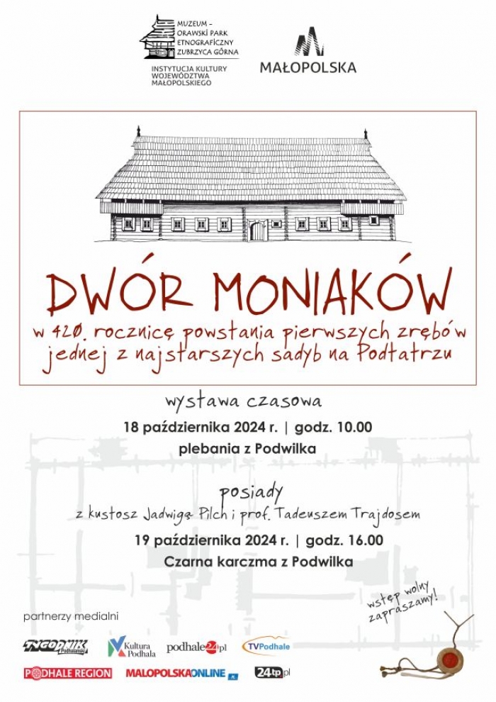 Muzeum zaprasza więc na wystawę czasową związaną z dworem: 18 października 2024 r. (piątek) o godz. 10.00 w plebanii z Podwilka w skansenie.Dwór Moniaków. W 420. rocznicę powstania pierwszych zrębów jednej z najstarszych sadyb na Podtatrzu. Po otwarciu wystawy zaś, muzeum razem Instytutem Rozwoju Orawy zaprasza do udziału w konferencji historycznej: "W 350. rocznicę nobilitacji sołtysich rodów Moniaków, Wilczków i Bukowińskich". Wydarzenie jest realizowane w ramach projektu "Orawa świętuje! Cykl wydarzeń skupionych wokół ważnych rocznic historycznych miejscowości Zubrzycy Dolnej i Zubrzycy Górnej?. Projekt zrealizowano przy wsparciu finansowym Województwa Małopolskiego. Szczegółowy program można znaleźć na www.orawa.eu