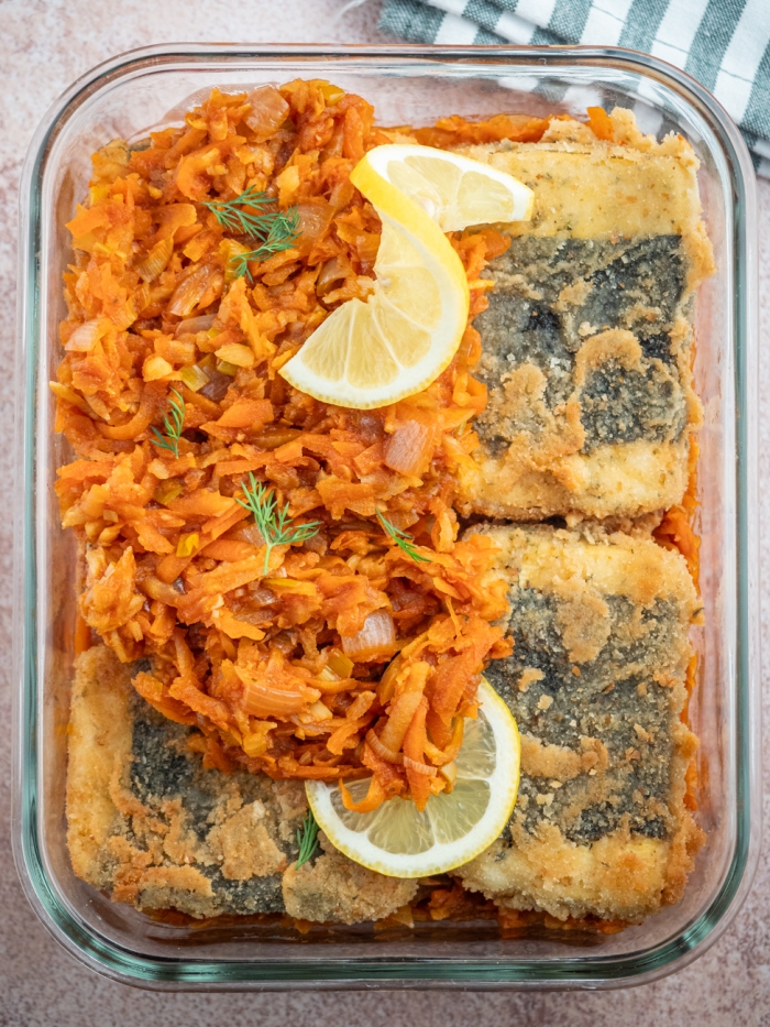 6. Na dnie żaroodpornego naczynia umieść kawałki tofuryby. Na nich rozłóż uduszone warzywa. Gdy potrawa wystygnie, przykryj naczynie i wstaw na noc do lodówki.