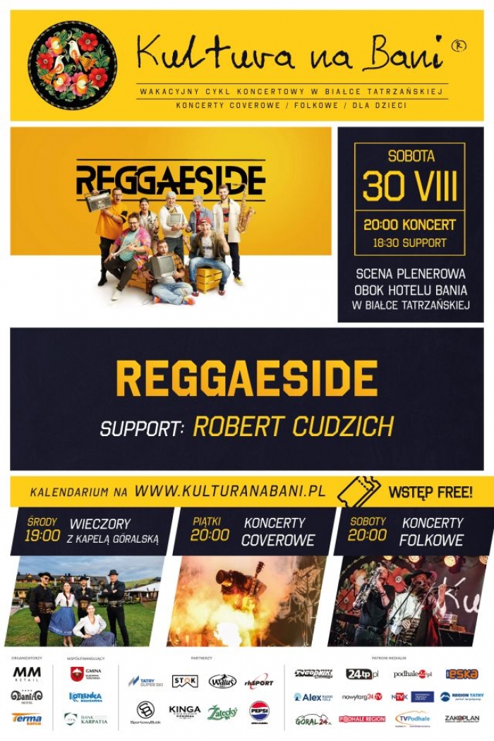 W sobotę o 18:30 na scenie Kultury na Bani wystąpi Robert Cudzich z zespołem - muzyk wykonujący kawałki z pogranicza country blues. O godzinie 20:00 na scenie zaprezentuje się energiczna grupa poruszająca się głównie w klimatach reggae, rock, pop i ska - Reggaeside!