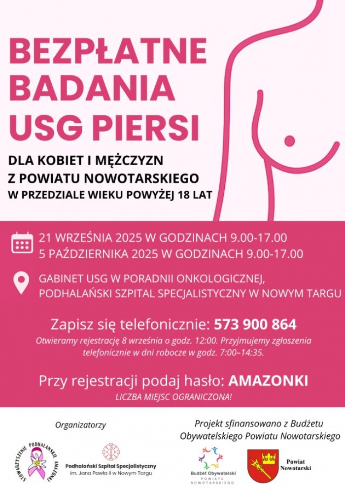 NOWY TARG. Stowarzyszenie Podhalańskie Amazonki realizuje projekt finansowany z Budżetu Obywatelskiego Powiatu Nowotarskiego, w ramach którego mieszkańcy powiatu mogą skorzystać z bezpłatnych badań USG piersi. Badania wykonywane będą w Podhalańskim Szpitalu Specjalistycznym im. Jana Pawła II.