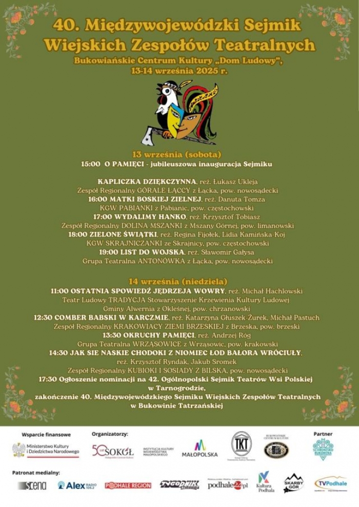 Zespoły teatralne z Małopolski zostały zakwalifikowane do udziału w wydarzeniu podczas 12. Małopolskich Spotkań Teatrów Amatorskich Posiady Teatralne na Orawie oraz 16. Małopolskiego Konkursu Obrzędów, Obyczajów i Zwyczajów Ludowych Pogórzańskie Gody w Łużnej. PROGRAM