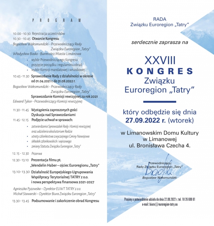 Jesienny kongres Euroregionu "Tatry" odbędzie się we wtorek 27 września w Limanowej.