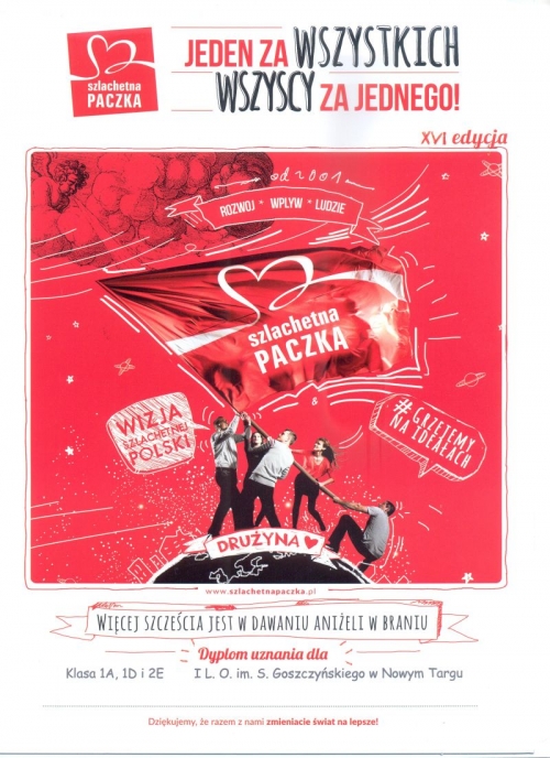 Członkowie klas 1a, 1d i 2e, zamiast tradycyjnej wymiany prezentów w ramach klasowych mikołajek, włączyli się w akcję Szlachetna Paczka. Postanowili pomóc konkretnej osobie, wybranej spośród potrzebujących wytypowanych przez wolontariuszy Paczki i zebrali na jej rzecz 2254 zł. Młodzież odpowiedziała na potrzeby samotnej starszej pani, borykającej się z problemami zdrowotnymi i osobistymi, wyposażając ją w podstawowe sprzęty gospodarstwa domowego, środki czystości oraz żywność. Uczniowie dołączyli również upominek świąteczny, chcąc podzielić się radością ze zbliżającego się Bożego Narodzenia. Według relacji z dostarczenia paczki, zakupione rzeczy sprawiły wybranej osobie wiele radości i bardzo ją wzruszyły. Były to rzeczy spełniające wszystkie standardy Szlachetniej Paczki - nowe, dobrej jakości i zaspokajały wskazane przez zainteresowaną potrzeby.Warto podkreślić, że pomysł wyszedł od uczniów - sami go przedstawili, sami zebrali pieniądze, sami zaplanowali jego relizację, sami zaangażowali dorosłych do pomocy, wtedy kiedy było to potrzebne. Inicjatorem i koordynatorem akcji była Marysia Jarkiewicz z klasy 1a.