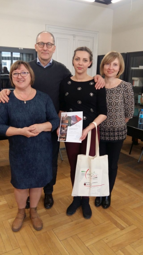 Po trudnych eliminacjach uczestnicy finału mieli przedstawić w dowolnej formie, przygotowaną wcześniej, prezentację w języku włoskim na jeden z tematów dotyczących Starożytnego Rzymu. Dominika brawurowo wskoczyła na podium wcielając się w postać Agrypiny Młodszej. Otrzymała za prezentację najwyższą ocenę, a do pełni zwycięstwa zabrakło jej jedynie kilku punktów z pierwszego etapu. Warto dodać, iż Dominika była jedyną uczennicą liceum spoza Krakowa. Nagrodę otrzymała z rąk Dyrektora Włoskiego Instytutu - p. Ugo Rufino.