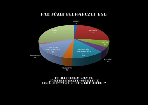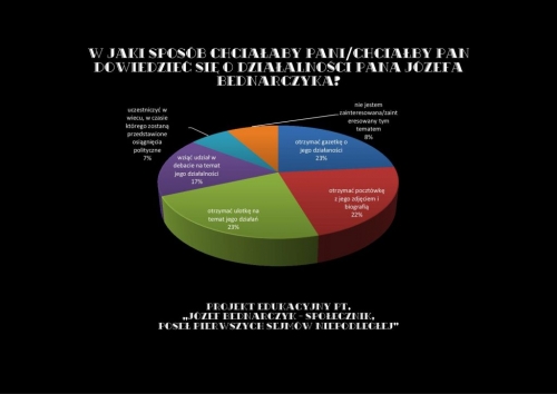 - Bardzo ważne było dla nas ostatnie pytanie, w którym respondenci mogli wybrać więcej niż jedną odpowiedź. Brzmiało ono: „W jaki sposób chciałaby Pani/chciałby Pan dowiedzieć się o działalności Pana Józefa Bednarczyka”. Wśród zaproponowanych przez nas sposobów, znalazły się te, które były dostępne w dwudziestoleciu międzywojennym. 23% respondentów chciałoby otrzymać gazetkę lub ulotkę, 22% zdjęcie z jego biografią, 17% wziąć udział w debacie na temat jego działalności, 6% uczestniczyć w wiecu, w czasie którego zostaną przedstawione osiągnięcia polityczne, 8% wykazało brak zainteresowania. – mówią Karol i Konrad.
