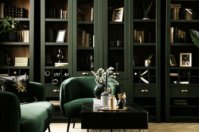 Kolor: dominują głębokie, nasycone barwy takie jak granat, szmaragdowa zieleń, burgund czy ciemny brąz, które wprowadzają do wnętrza atmosferę elegancji i spokoju. Jednak do stworzenia bardziej subtelnej, ale równie eleganckiej aranżacji mogą być użyte pastelowe odcienie, np. pudrowy róż, błękit czy beż.